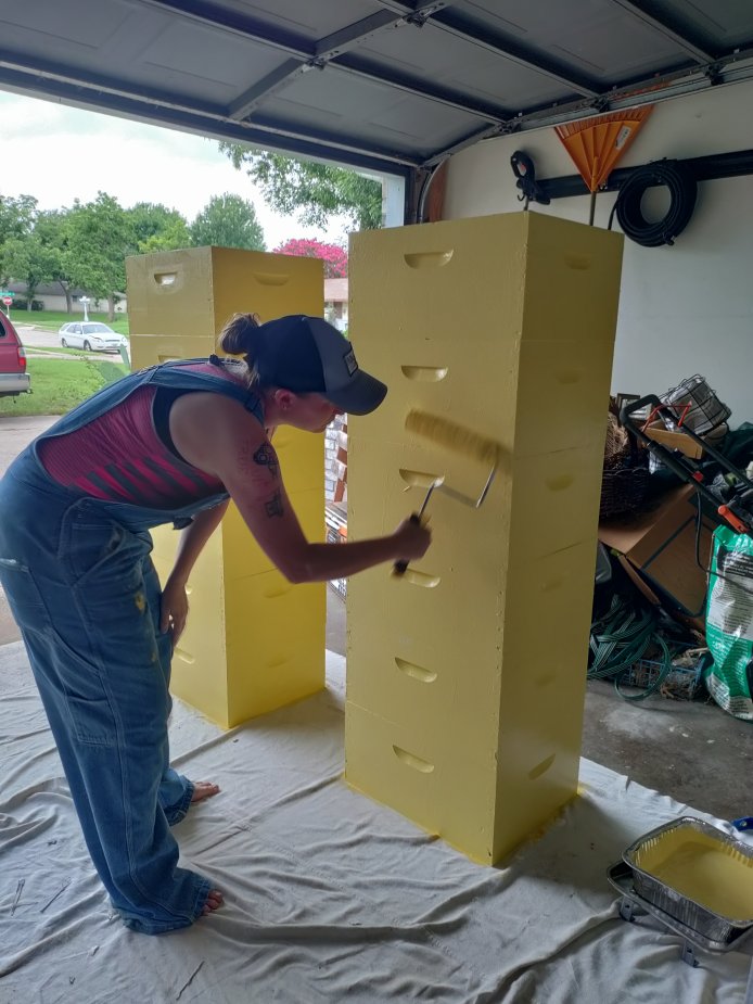 We’ve assembled new hive equipment, including medium supers and deep boxes, then applied a coat of primer and paint to protect and preserve them.