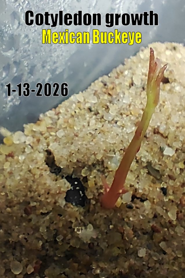 Seeds germinate and the radical and cotyledon emerge in approximately 3-7 days (My experience was closer to 3 days – with the seeds being in damp sand in a shallow container sitting on a 20-watt seed warming mat). After germination – at approximately 7 days – I placed each emerged seedling into a deep tree-pot for the root systems to develop fully.