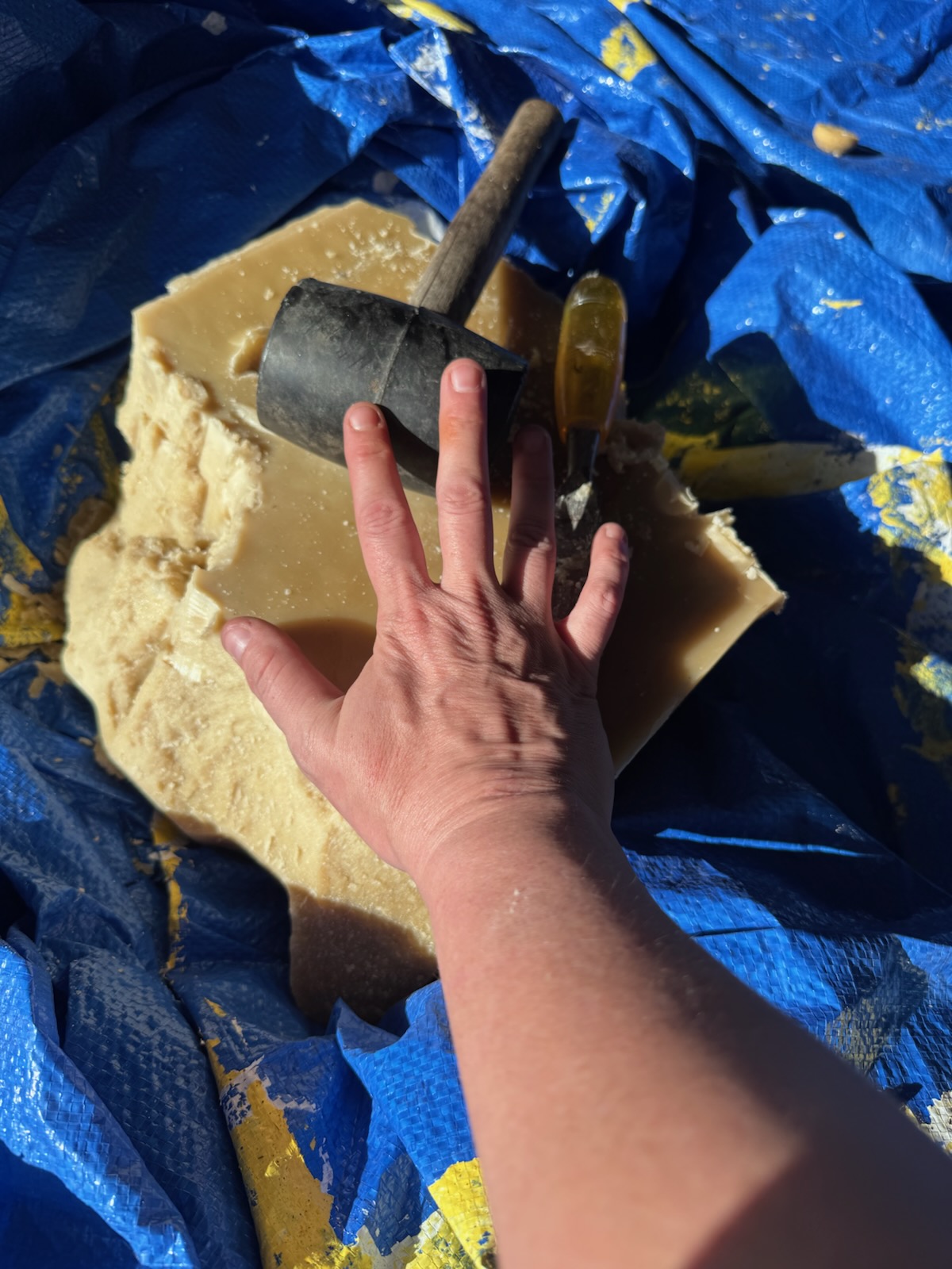 As we have been watching the plants takeoff, and some already in blossom, we are making our rounds to the bees to provide them with more space before their urge of swarming begins. On rainy days, we have been adding wax to brand new frames. This entails melting down wax and rolling it on to the frames.