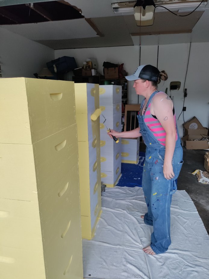 As we are providing more space for the bees, we are giving them the freshly waxed frames. In some case, we have been replacing older hive bodies with newly painted yellow hive bodies that we assembled, primed, and painted over the winter. We know that the honey bees will enjoy their upgraded accommodations! Welcome to spring, honey bees!