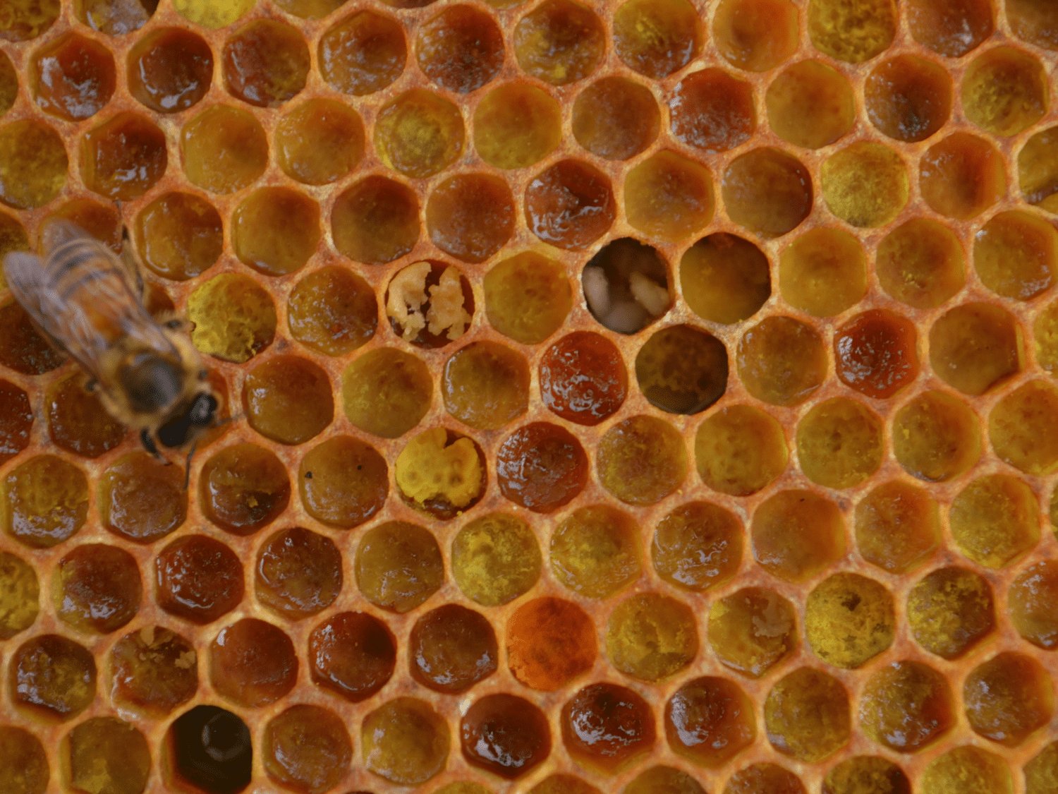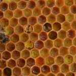 With warmer temperatures upon us, the honeybees are gearing up for reproduction. We are noticing our queen bees laying many more eggs, which means her worker bees are bringing in a significant amount of pollen. The pollen is deposited within the cells of the frame and then made into something called bee bread, also known as baby food for honey bees.